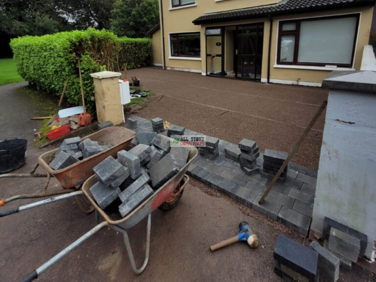 This driveway has been completed by All Stone Driveways in Cork City, featuring grey mix of block paving with charcoal border and kerbing on top of a new hardcore foundation with weed control membrane.