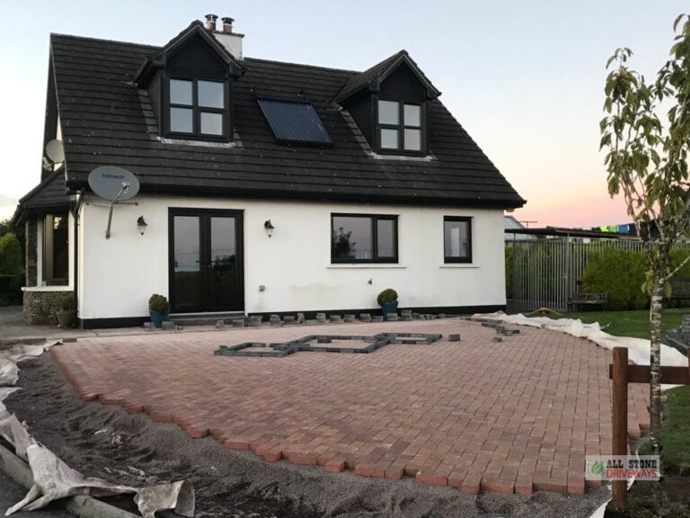 This patio, laid with slane rustic multi-coloured bricks, charcoal border with diamond pattern and gravel shrubberies, has been installed by All Stone Driveways in East Cork.